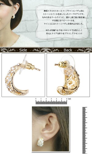 ギフト対応 素材: 真鍮製 プラチナロジウム/ゴールドコーティング ゴールドのみニッケルフリーラインストーン パール スタッドピアス ディスクキャッチ サイズ: 全長:縦約18mm×横11.5mm×厚み5mm ストーン:約2mm パール:約1.7mm ポスト太さ/長さ:0.8mm/11mm 艶感メタルのスモールフープラインにパヴェ状にストーンとパールをあしらったフープピアスです。