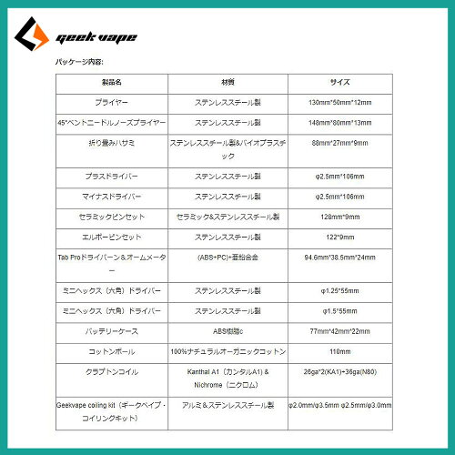 【お勧めの関連商品】 Coil Master Building Mat ( コイルマスター ビルディングマット ) 商品詳細 〇 商品サイズ:H:218mm x W:174mm x W:52.8mm 〇 重量:946g 〇 定格電圧:3.2-4.2V 〇 定格出力:50W 〇 最大電圧出力:9V±0.1V 〇 シェル材質:(ABS * PC)*亜鉛合金 〇 身長:94.6 * 38.5 * 24.0mm 〇 シェルカラー:マットブラック 〇 スタンバイ電流:シャットダウン状態≦ 25uA 〇 スタンバイ状態≦ 50mA 〇 電源出力モード:自動電源 〇 ステップアップ/ステップダウン 〇 抵抗検出範囲:0.05ohm〜3ohm 〇 抵抗検出精度:0.02ohm 〇 低バッテリ電圧警告:3.2V +/- 0.1V 〇 PCBA温度警告:85C 〇 定格抵抗範囲:0.1〜3Ω 〇 最大出力時間:10秒 〇 電池の互換性:単18650リチウム電池 〇 動作温度範囲:-10〜40℃ 〇 充電仕様:5V 1A ※ステータス表示:赤LEOはバッテリの状態を示します 青いLEOは動作状態を示します 商品内容 〇 オタクテープ521タブプロ×1 〇 斜めプライヤー×1 〇 45度ベントニードルノーズプライヤー×1 〇 折りたたみはさみ×1 〇 プラスドライバー(φ2.5mm×106mm)×1 〇 フラットヘッドスクリュードライバー(φ2.5mm×106mm)×1 〇 セラミックピンセット×1 〇 エルボーピンセット×1 〇 タブプロ×1 〇 ミニHEXスクリュードライバー(φ1.25×55mm /φ1.5×55mm)×2 〇 バッテリーケース×1 〇 コットンボール×1 〇 クラプトンコイル(26ga×2(KA1)+ 36ga(N80))×1 〇 Geekvape Coiling Kit(φ2.0mm/φ3.5mmφ2.5mm/φ3.0mm)×1 その他関連商品 この商品に必要なパーツページ ブランド商品一覧
